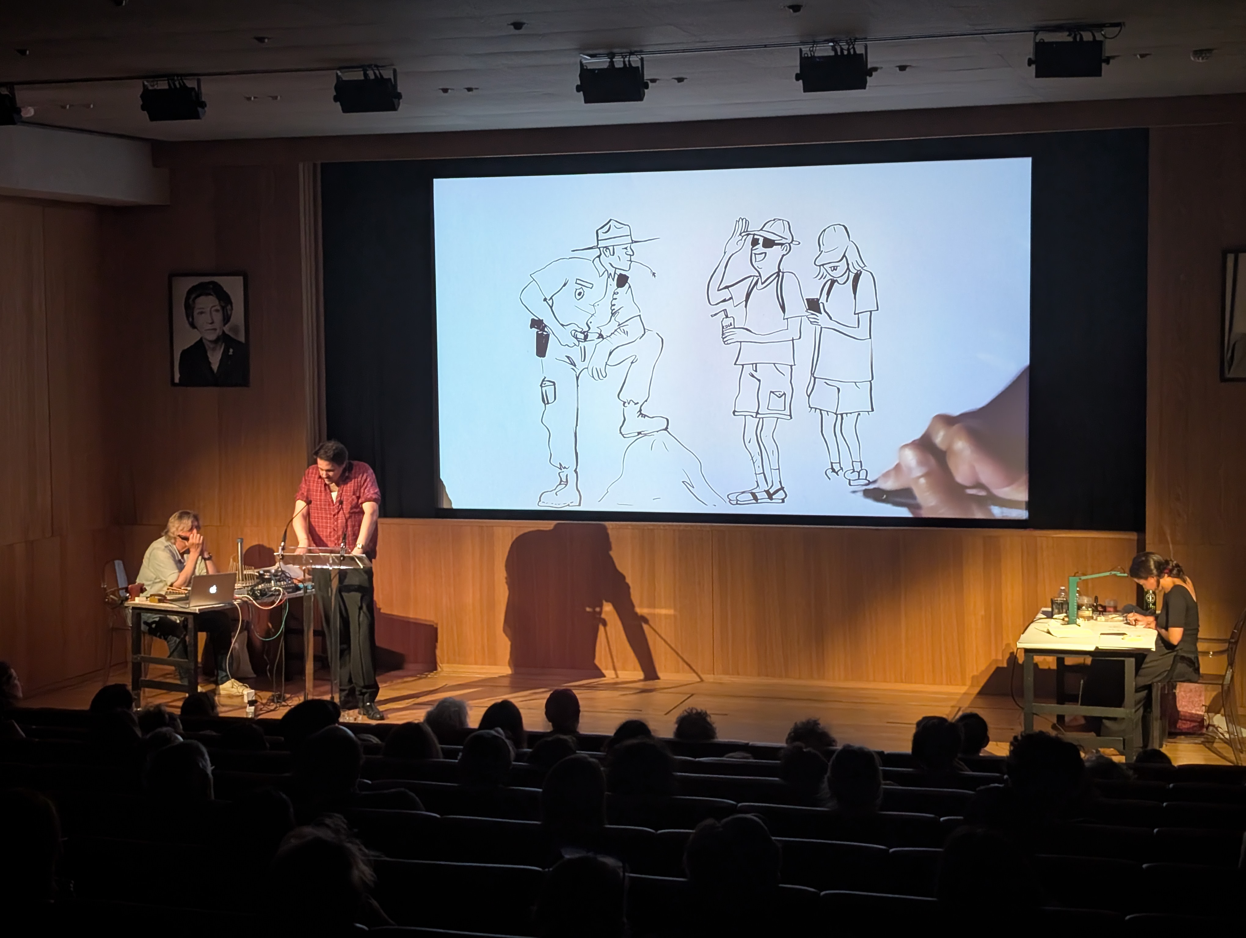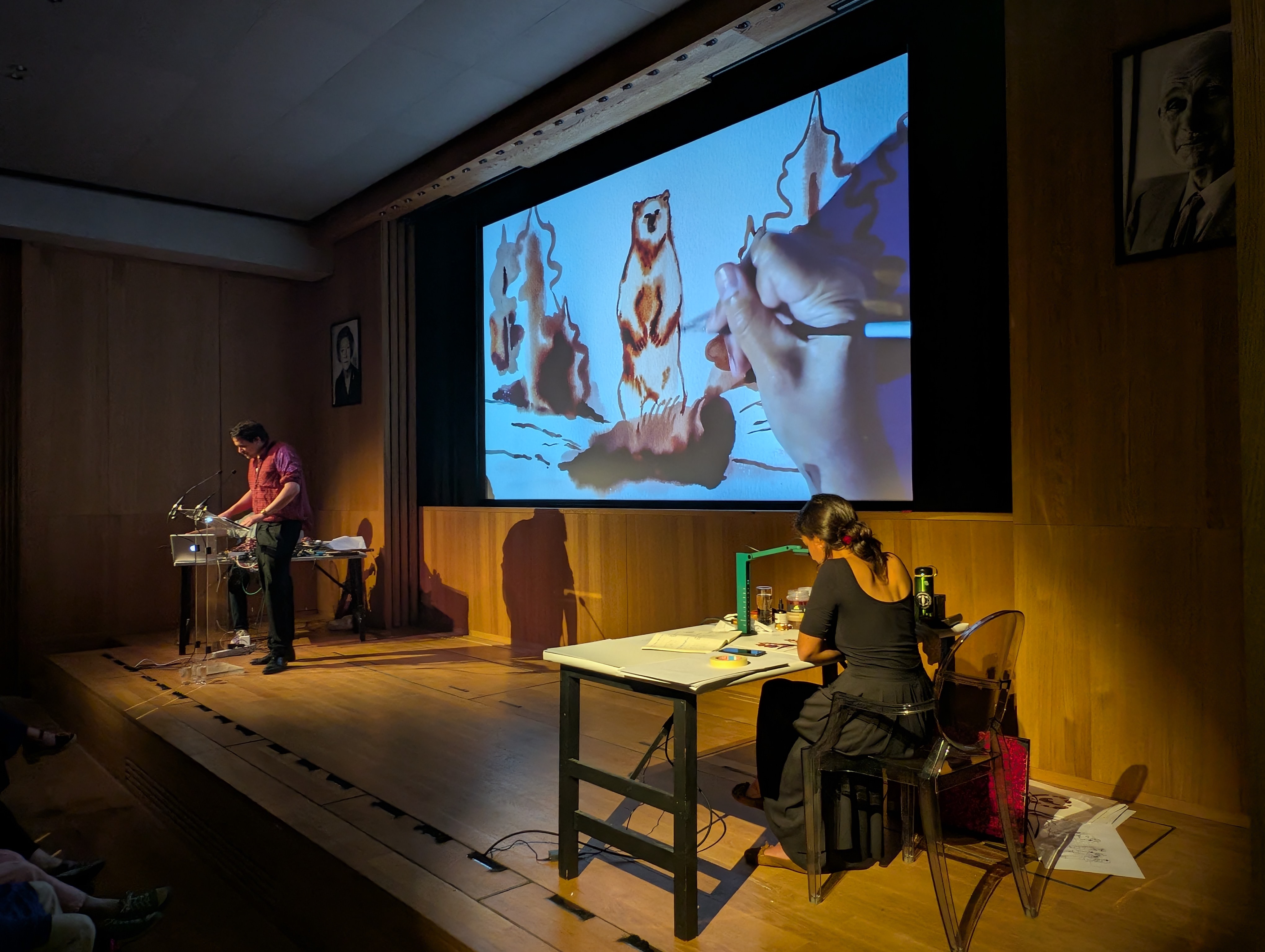 Les dessins ont été composés en direct, au rythme des lectures de Julia Bourdet et Clément Balcon, et de l’accompagnement sonore du musicien Michel Risse.